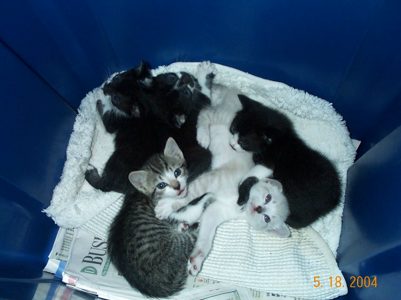 | 5 abandoned kittens a few weeks after we found them From the left: Monkey Mouse, Jack, Cocoa, and Tux with Jasmine (the grey tabby in the font) |